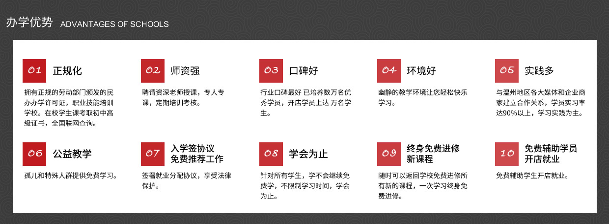 我校以培養(yǎng)實(shí)用型專業(yè)人才為目標(biāo),理論學(xué)習(xí)、操作訓(xùn)練與專業(yè)實(shí)踐三位一體,實(shí)行一對(duì)一的教學(xué)模式,常年招生,男女不限。畢業(yè)后推薦工作、 主要是以理論為輔實(shí)操為主的教學(xué)模式授課。老師手把手教、一對(duì)一輔導(dǎo),為學(xué)員量身定做課程,保證學(xué)會(huì)為止、 中途不收取任何費(fèi)用,(無(wú)任何隱形消費(fèi))進(jìn)修新的課程。、簽約教學(xué)、幫助學(xué)員開(kāi)店就業(yè),免費(fèi)試學(xué)(讓您全方位的體驗(yàn)我們的專業(yè)、讓你不花一分冤枉錢(qián)。)